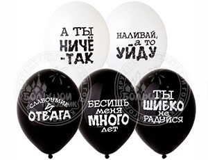 Высококачественный шар из натурального латекса. Шары белого и черного цвета. Пастель - матовый оттенок цвета. С двусторонним шелкографическими рисунком - надписями: Бесишь меня много лет. Наливай, а то уйду. А ты ниче так. Ты шибко не радуйся. Слабоумие и отвага. Идеальный ассортимент для розничной продажи воздушных шариков и украшения праздника. Воздушные шары изготавливаются из экологически безопасного 100%-ного натурального латекса. В окружающей среде разлагаются на безопасные компоненты примерно с той-же скоростью, как обычные листья деревьев. После использования лопнуть и утилизировать как бытовой отход