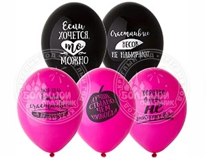 Высококачественный шар из натурального латекса. Ассорти из двух цветов, одного типа - пастель - матовый оттенок цвета. Шары с двусторонним шелкографическими рисунком - надписями: Лучше стыдно, чем никогда. Если хочется, то можно. Коротко о себе: не рекомендую. Счастливые весов не набирают. Моя цель - быть счастливой, а не трезвой. Идеальный ассортимент для розничной продажи воздушных шариков и украшения праздника. Воздушные шары изготавливаются из экологически безопасного 100%-ного натурального латекса. В окружающей среде разлагаются на безопасные компоненты примерно с той-же скоростью, как обычные листья деревьев. После использования лопнуть и утилизировать как бытовой отход.