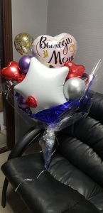 Букет состоит из фольгированных шаров разных форм и цветов, надутых воздухом. Может быть абсолютно любой тематики и цветовой гаммы. С таким букетом можно пойти на День Рождения, на выписку из роддома, на 1 сентября, на День Учителя. Его можно подарить маме, любимой девушке, подруге, мужу, директору и т.п.