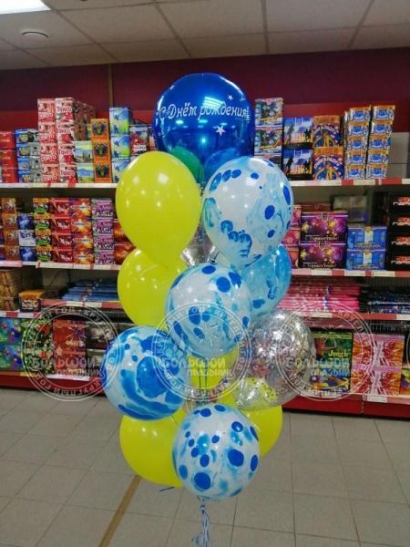 Фонтан из:1 шт. круг фольгированый1 шт. наклейка3 шт. шар с конфетти5 шт. шар пастель5 шт. шар с рисунком1 шт. грузик