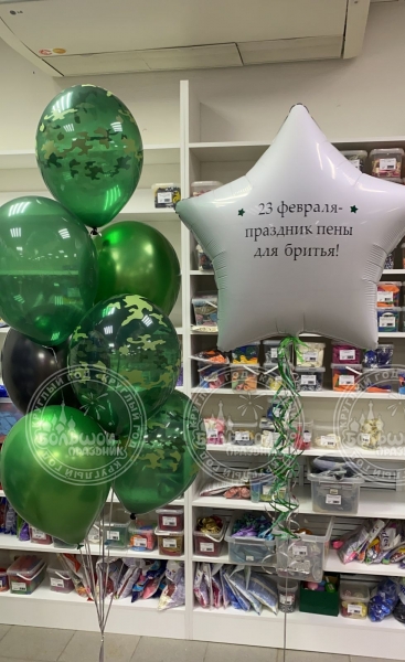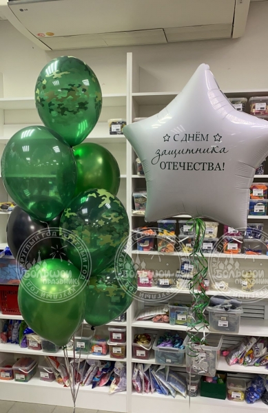 Композиция состоит из:-1 шар звезда с надписью с двух сторон;-Фонтан из:2 шт. шар хром; 3 шт. шар Камуфляж;2 шт. шар постель;1 шт. грузик.