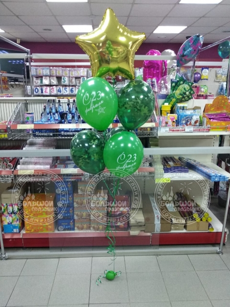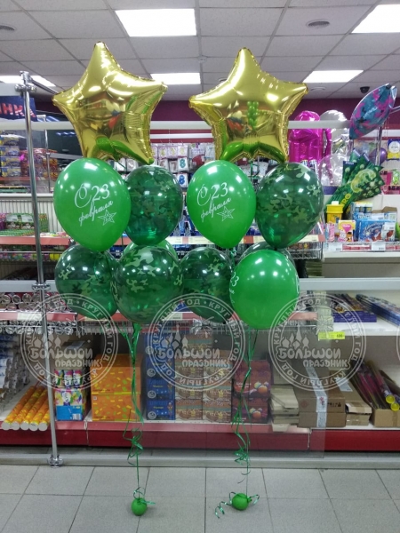 1 Фонтан из:1 шт. Звезда фольга2 шт. 23 ФЕВРАЛЯ3 шт. Камуфляж1 шт. грузик