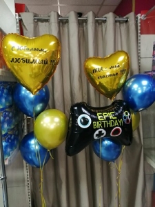 Композиция состоит из:2 шт. сердце фольга 2 шт. наклейки1 шт. фигура фольга 6 шт. шар хром 3 шт. грузик.