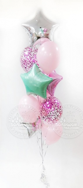 Фонтан из:4 шт. звезда фольга без рисунка2 шт. шар с конфетти5 шт. шар пастель1 шт. грузик