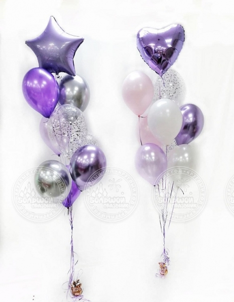 Фонтан из:1 шт. сердце фольга1 шт. звезда фольга4 шт. шар с конфетти4 шт. шар металлик3 шт. шар пастель5 шт. хром2 шт. грузик