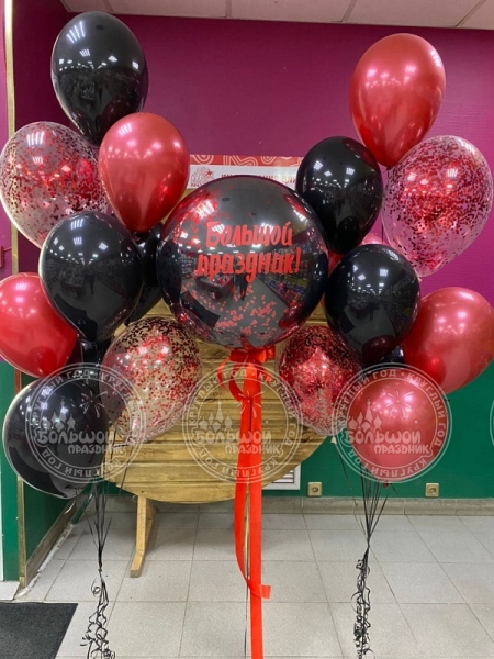 1 Фонтан из:1 шт. большой шар с наклейкой и конфетти.8 шт. шар пастель6 шт. шары хром.4 шт. шар с конфетти3 шт. грузик