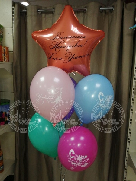 Фонтан из 6 шаров. 1 шт. звезда фольга 1 шт. наклейка на звезду5 шт. шар с рисунком 1 шт. грузик