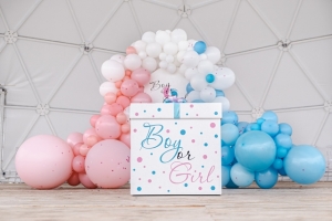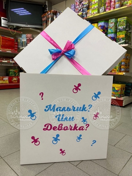 Воздушные шары в коробке 60х60х60. Индивидуальная надпись на одной стороне коробки, атласная лента.