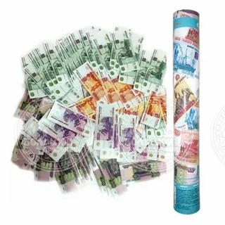 Пневмохлопушка размером 40см. В качестве наполнения используются купюры в виде рублей номиналом 100 руб., 500руб., 1000руб, 5000руб. Дальность выстрела 5-8м.