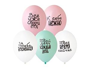 Высококачественный шар из натурального латекса. Ассорти из нескольких цветов, одного типа - пастель - матовый оттенок цвета. Шары с двусторонним шелкографическими рисунком - надписями: Твое время сейчас. Вселенная за Тебя. Все уже получается. К себе нежно. Твой день, каждый день. Идеальный ассортимент для розничной продажи воздушных шариков и украшения праздника. Воздушные шары изготавливаются из экологически безопасного 100%-ного натурального латекса. В окружающей среде разлагаются на безопасные компоненты примерно с той-же скоростью, как обычные листья деревьев. После использования лопнуть и утилизировать как бытовой отход.
