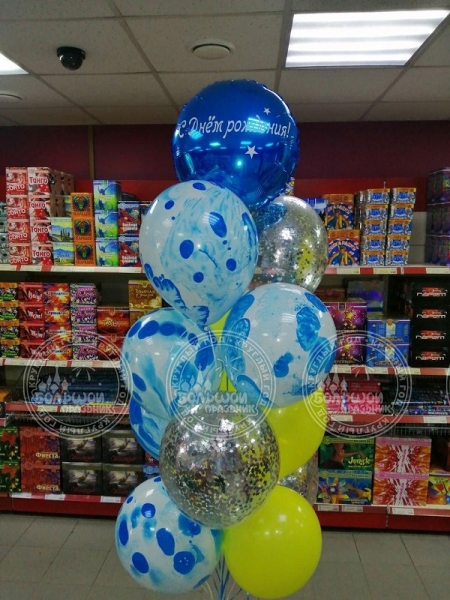 Фонтан из:1 шт. круг фольгированый1 шт. наклейка3 шт. шар с конфетти5 шт. шар пастель5 шт. шар с рисунком1 шт. грузик
