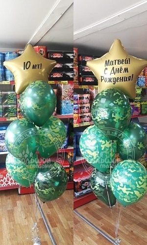 1 Фонтан из:1 шт. звезда фольга6 шт. камуфляж1 шт. наклейка1 шт. грузик