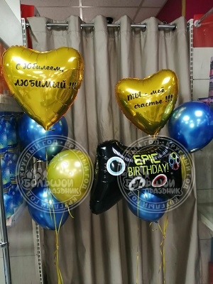 Композиция состоит из:2 шт. сердце фольга 2 шт. наклейки1 шт. фигура фольга 6 шт. шар хром 3 шт. грузик.