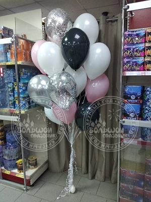 1 Фонтан из:5 шт. белый пастель5 шт. розовый пастель5 шт. черный пастель3 шт. хром серебро2 шт. шар с конфетти серебро1 шт. грузик.
