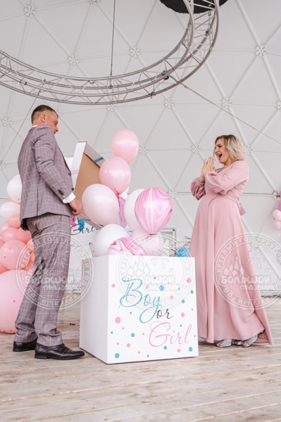Воздушные шары в коробке 60х60х60. Индивидуальная надпись на одной стороне коробки, атласная лента.