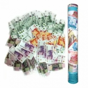 Пневмохлопушка размером 40см. В качестве наполнения используются купюры в виде рублей номиналом 100 руб., 500руб., 1000руб, 5000руб. Дальность выстрела 5-8м.