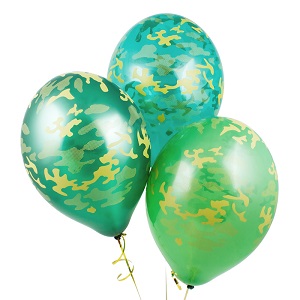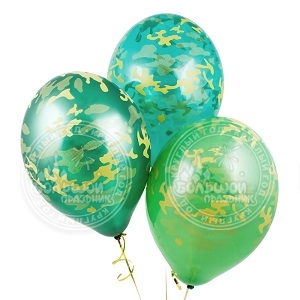 Ассорти из шаров разного типа - кристалл, пастель и металлик зеленого цвета с рисунком, имитирующим камуфляж. Событие - День Защитника отечества.Изготовитель: (Belbal)